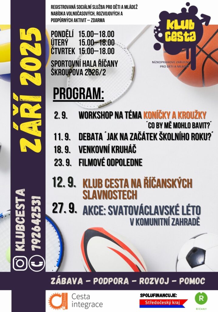 Se začátkem školního roku upravujeme i provoz klubu. Od 8. září bude klub ve Sportovní hale otevřený vždy v pondělí, úterý a čtvrtek od 15 do 18 hodin. Středy a další odpolední čas věnujeme terénní službě a spolupráci se školami. Potkat se námi můžete také na veřejných akcích, například na Říčanských slavnostech.